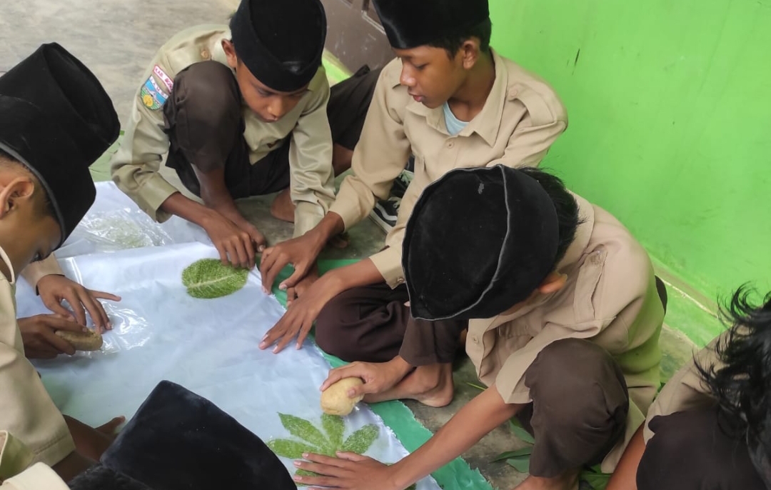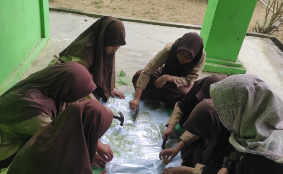 Guru yang juga mengampu mata Pelajaran Prakarya itu mencetuskan urutan teknik membuat ecoprint. “Pertama, kita harus memastikan bahwa warna kain adalah terang seperti warna putih, Kedua, letakan daun yang memiliki kandungan air yang lumayan banyak diatas permukaan kain. ketiga, Letakan plastik bening kemudian di tumbuk permukaan daun nya.,†jelas taufik.