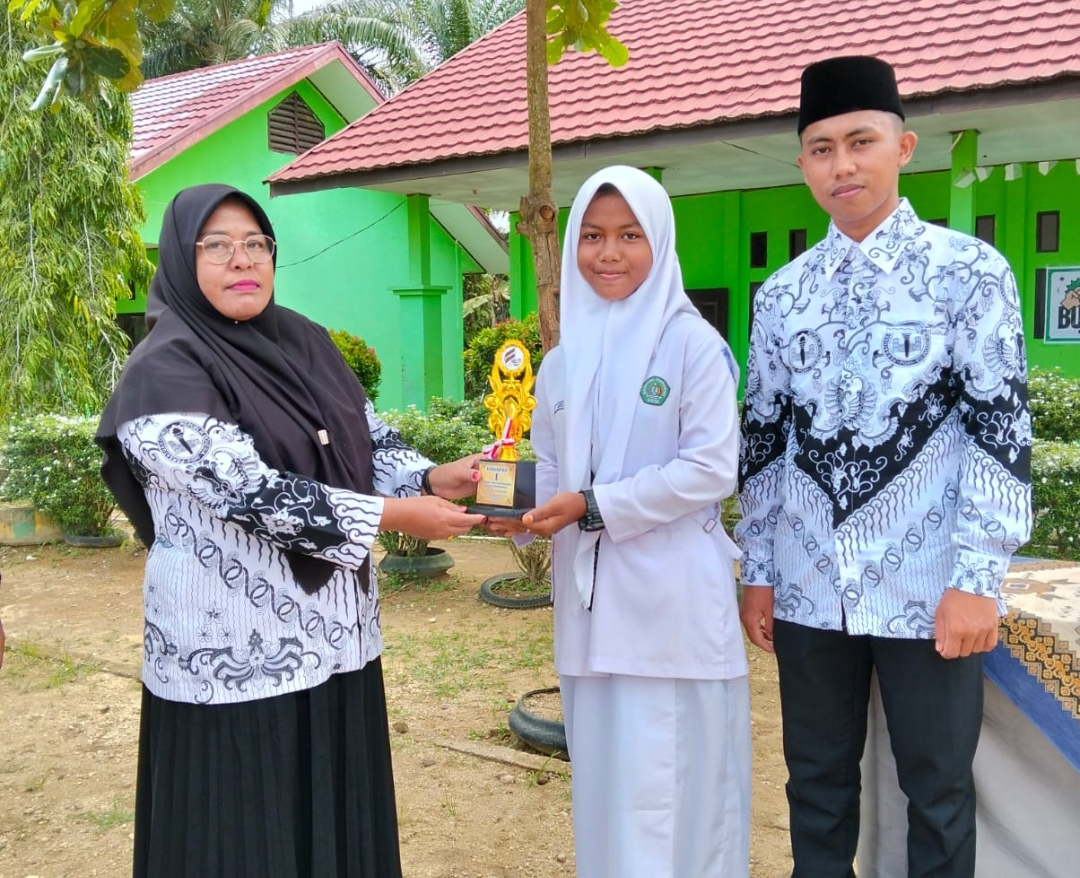 Penyerahan dilakukan dengan cara menyerahkan piala dari Pratama Putra dan Pratama putri Yakni Gathan dan Nursamsiah kepada Kepala Madrasah Yang diwakili oleh waka Kesiswaan Ibu Umi Kalsum, S.Ag untuk di simpan di lemari trofi madrasah.