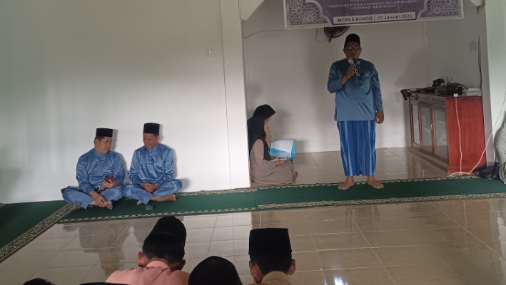 Bungo, (Humas MTsN 8 Bungo) - Pada hari Jumat, 31 Januari 2025, Madrasah Tsanawiyah Negeri (MTsN) 8 Bungo mengadakan kegiatan peringatan Isra Mi'raj Nabi Muhammad SAW dengan mengangkat tema "Meningkatkan Ukhwah dalam Bingkai Moderasi Beragama". Kegiatan ini dihadiri oleh seluruh siswa, guru, dan staf madrasah dengan penuh antusias.