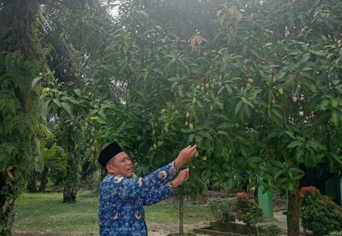 MTsN 8 Bungo, Rabu 24 September 2025 – Suasana madrasah semakin semarak dengan datangnya musim buah. Lingkungan MTsN 8 Bungo yang dikenal asri dan hijau kini tengah menyuguhkan pemandangan menawan. Sejumlah tanaman buah yang ditanam di sekitar halaman dan kebun madrasah mulai menunjukkan hasilnya. Pohon mangga yang rindang kini telah dipenuhi buah yang menggantung indah, menandakan waktu panen besar sebentar lagi tiba.