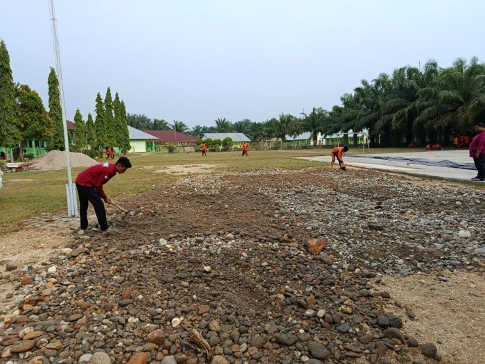 Suasana pagi itu tampak begitu semarak. Para siswa dengan penuh antusias membantu membawa ember berisi adukan semen, pasir, dan kerikil, sementara sebagian lainnya menyiapkan peralatan kerja. Majelis guru pun tak tinggal diam, mereka ikut bergabung, memberi arahan sekaligus ikut serta dalam proses pengecoran. Terlihat jelas, antara siswa dan guru tidak ada jarak—semua berbaur menjadi satu tim yang solid demi terwujudnya lapangan yang kokoh dan bermanfaat bagi kegiatan sekolah.