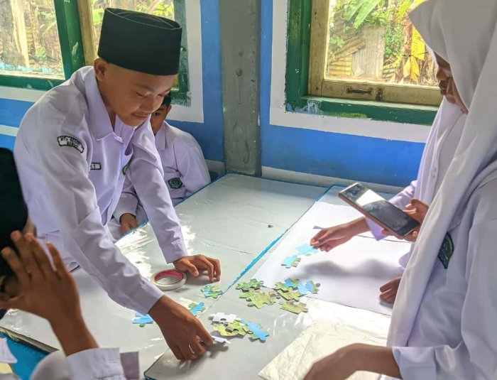 Siswa kelas VII A MTsN 8 Bungo mengikuti pembelajaran Bahasa Indonesia yang berbeda dari biasanya pada hari yang penuh semangat. Dalam kegiatan ini, mereka didampingi oleh guru mata pelajaran, Ibu Nurul Hidayah, S.Pd., untuk mempelajari materi Teks Deskripsi dengan metode kreatif, yaitu menyusun puzzle.