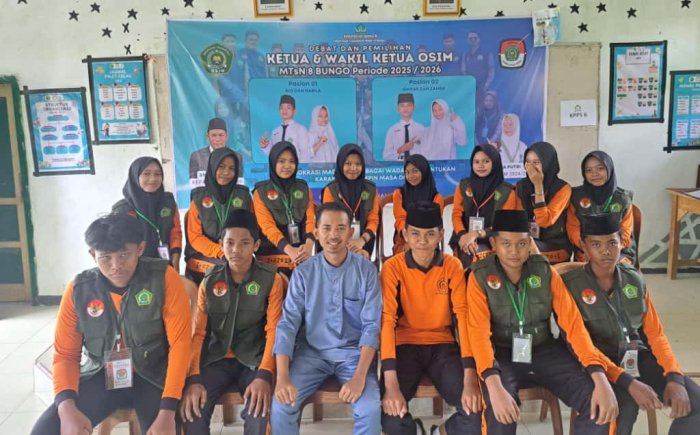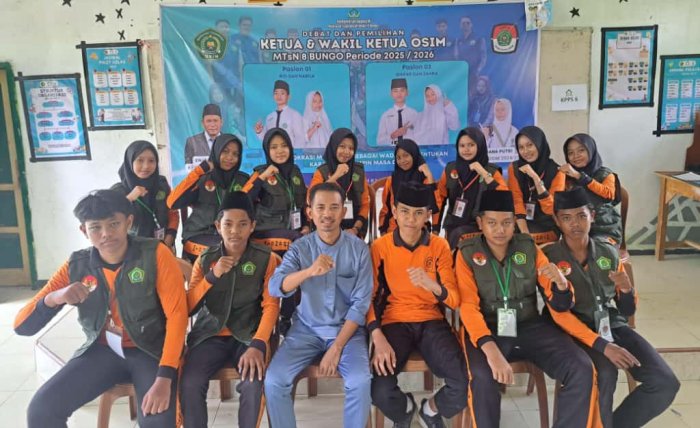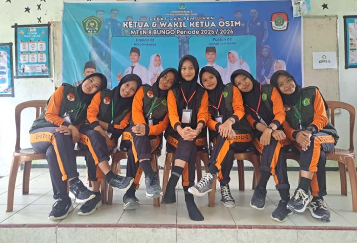 Bungo, Sabtu, 11 Oktober 2025 — Suasana penuh semangat demokrasi terasa di lingkungan MTsN 8 Bungo. Selama dua hari berturut-turut, Jumat dan Sabtu, 10–11 Oktober 2025, rangkaian kegiatan pesta demokrasi siswa berjalan dengan sukses dan lancar. Kegiatan yang menjadi momen penting bagi seluruh warga madrasah ini merupakan bagian dari proses pemilihan Ketua dan Wakil Ketua Organisasi Siswa Intra Madrasah (OSIM) periode 2025/2026.