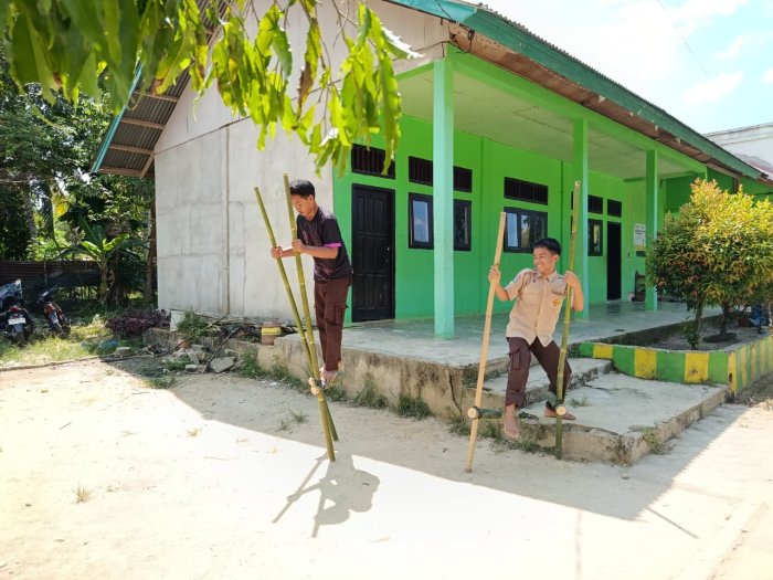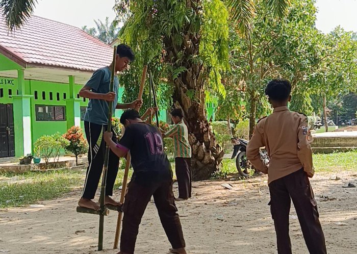Bungo, 30 Oktober 2025 – Suasana sore di halaman MTsN 8 Bungo tampak begitu hidup dan penuh semangat. Puluhan anggota Pramuka dari Gugus Depan 09.167–09.168 Pangkalan MTsN 8 Bungo tampak berbaris rapi, bersiap mengikuti kegiatan latihan rutin yang kali ini sedikit berbeda dari biasanya. Jika pada pertemuan sebelumnya mereka berlatih tali-temali, baris-berbaris, dan semaphore, maka pada latihan kali ini para anggota diajak bermain enggrang, sebuah permainan tradisional yang menguji keseimbangan, konsentrasi, dan keberanian.