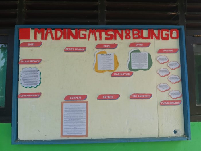 Kepala madrasah turut mengapresiasi langkah kreatif para siswa yang telah bekerja keras mewarnai mading sekolah. Dengan semangat kolaborasi, mading MTsN 8 Bungo terus berkembang menjadi media literasi yang berkualitas dan membanggakan.