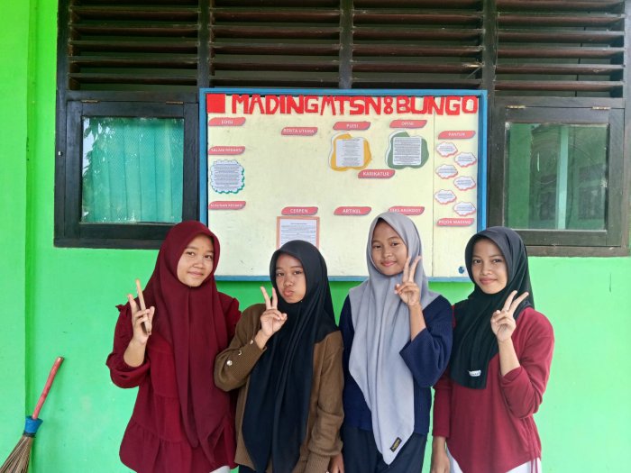 “Kami ingin mading MTsN 8 Bungo menjadi tempat yang hidup. Setiap bulan harus ada konten baru agar siswa senang membaca dan termotivasi untuk ikut berkarya. Alhamdulillah seluruh anggota sangat kompak dalam proses pengisian mading kali ini,” ujar Aina.