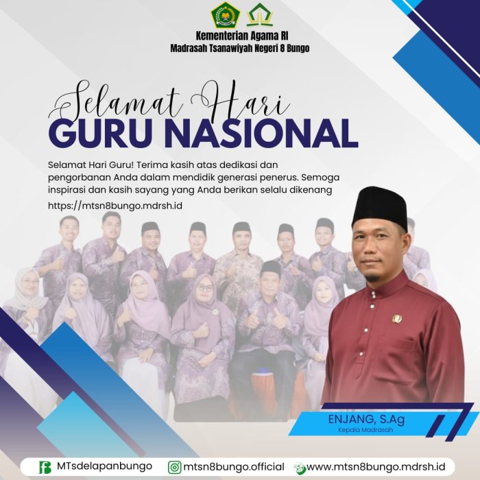 “Atas nama keluarga besar MTsN 8 Bungo, saya mengucapkan terima kasih dan apresiasi yang sebesar-besarnya kepada seluruh guru. Semoga semangat mengabdi, keikhlasan, dan cinta kita kepada peserta didik menjadi amal jariyah yang terus mengalir. Selamat Hari Guru Nasional ke-80. Jadilah guru yang terus belajar, berinovasi, dan menginspirasi,” ujar Bapak Enjang, S.Ag.