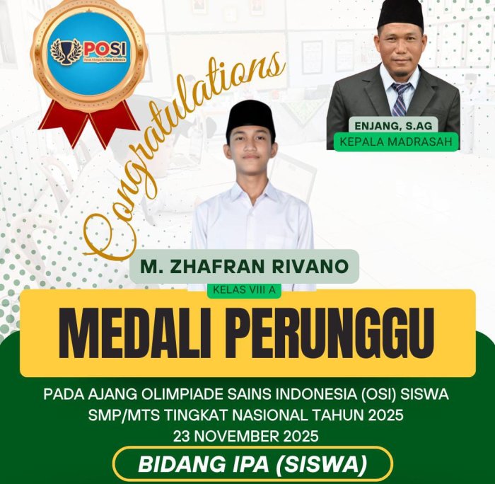 Bungo, 26 November 2025 — Kabar membanggakan kembali datang dari MTsN 8 Bungo. Salah satu siswa berprestasi, M. Zhafran Rivano dari kelas VIII A, berhasil meraih medali perunggu pada ajang Olimpiade Sains Indonesia (OSI) tingkat nasional bidang Ilmu Pengetahuan Alam (IPA), yang diselenggarakan pada Rabu, 23 November 2025.