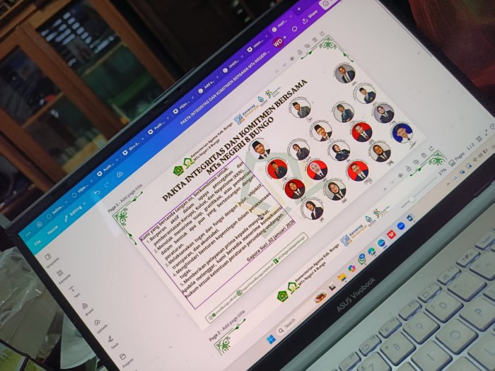 Bungo, 28 Maret 2026 – Dalam upaya memperkuat budaya integritas dan meneguhkan komitmen bersama di lingkungan madrasah, Humas MTsN 8 Bungo, Bapak Taufik Hidayattuloh, S.Si., M.Si., mengambil langkah strategis dengan menyiapkan desain spanduk bertema Fakta Integritas dan Komitmen Bersama MTsN 8 Bungo. Kegiatan ini menjadi bagian penting dalam membangun karakter warga madrasah yang jujur, disiplin, dan bertanggung jawab.
