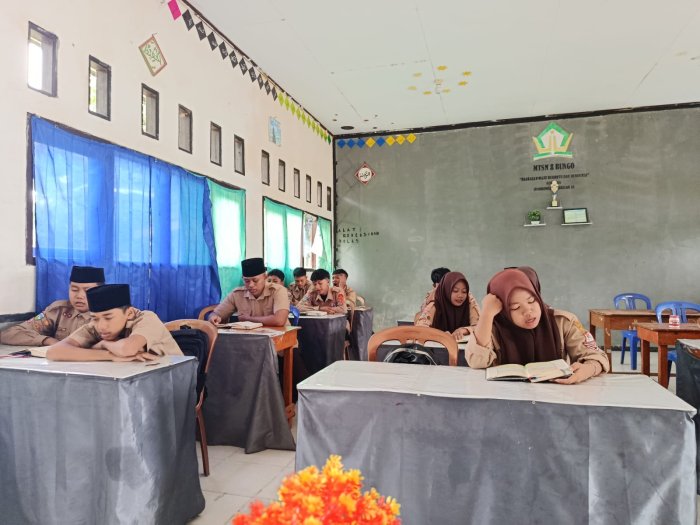 Bungo, 9 April 2026 – Suasana pagi di MTsN 8 Bungo tampak berbeda dari biasanya. Sebelum kegiatan belajar mengajar dimulai, setiap ruang kelas dipenuhi lantunan ayat suci Al-Qur’an yang dibaca dengan penuh khidmat oleh para siswa bersama guru yang mengajar di jam pertama. Kegiatan ini merupakan program rutin madrasah berupa tadarus dan fahmil Qur’an yang dilaksanakan setiap pagi sebagai bagian dari pembinaan karakter religius peserta didik.